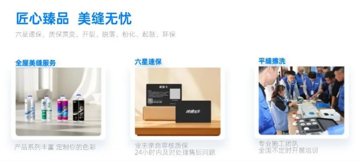 速缝先生除了提供全屋美缝施工服务,更有一户一保,使用更加放心,六星速保,品质更高,服务更好